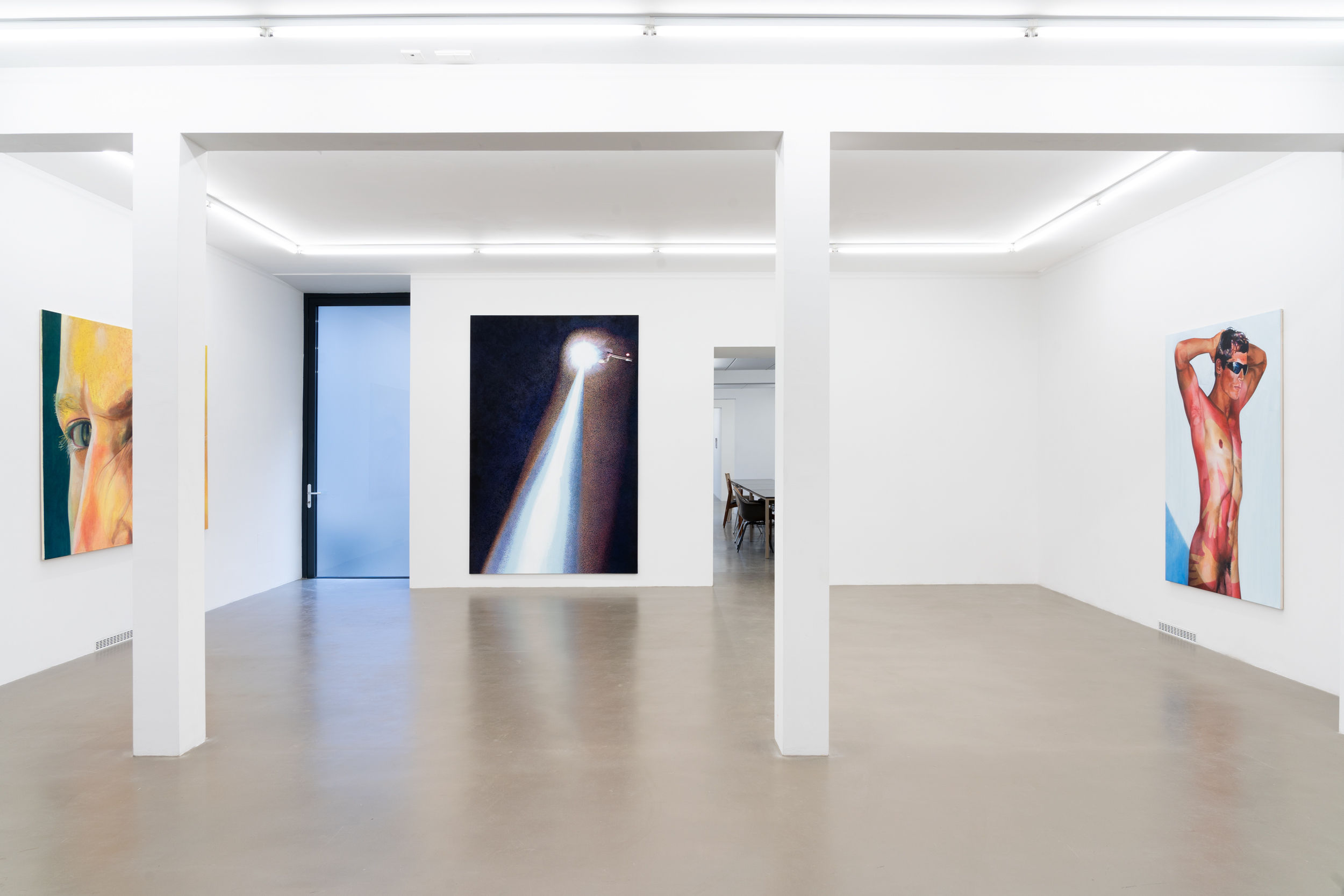 Lin Olschowka’s paintings offer us glimpses of a world that we would not necessarily wish to live in at first glance: the surroundings are cold, the light harsh and the bodies resemble interchangeable objects rather than characterful subjects. One image shows a young, white, conventionally attractive woman in a bikini in an open tanning bed. In another, a glaring beam from a helicopter forms a cone of light in the darkness. Another painting presents the cut, bloody palm of a fleshy hand.